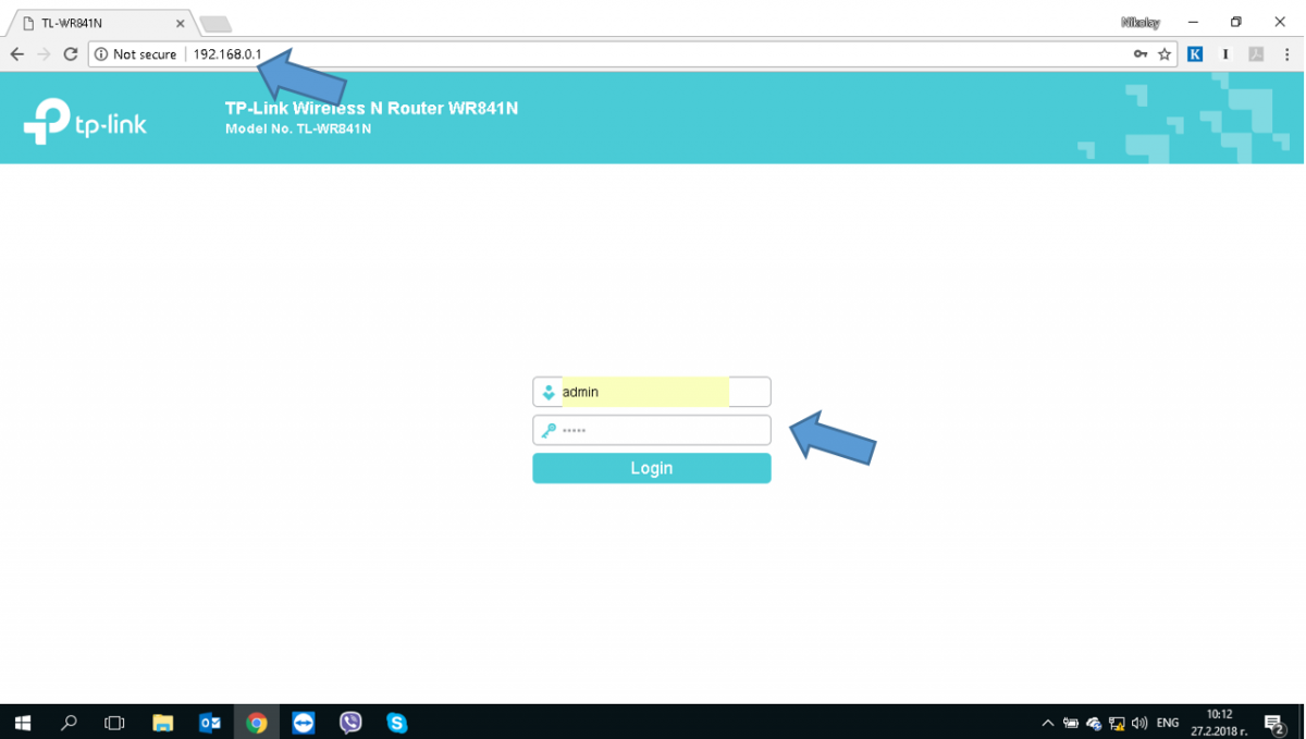 Стъпка 2: Достъпете в интерфейса на устройство „TP-Link TL-WR841N” като  в интернет браузъра е нужно да впишете ръчно адрес 192.168.0.1 или 192.168.1.1 и да потвърдите с бутон „Enter“ от клавиатурата. Точният адрес на Вашия рутер е записан в упътването му.  Въведете в полетата User name: admin и парола : admin